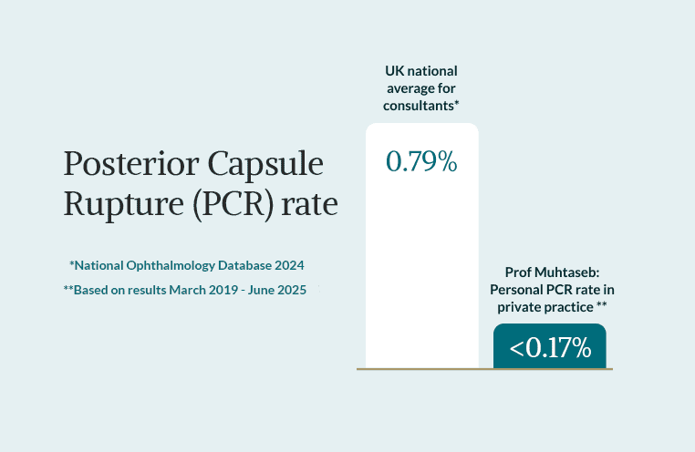 Prof Muhtaseb is pleased to report a personal rate of Posterior Capsule Rupture (PCR) which is significantly lower than the national average for consultants, reflecting high standard of surgical safety in his practice.